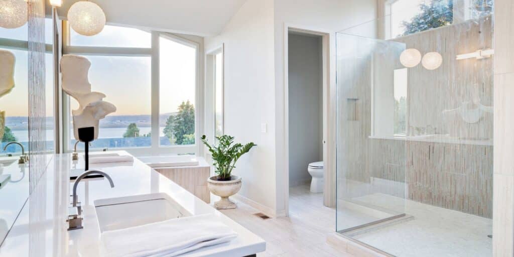 Frameless swinging shower doors and custom glass panels create open, elegant bathrooms that fit Bellevue’s contemporary style.