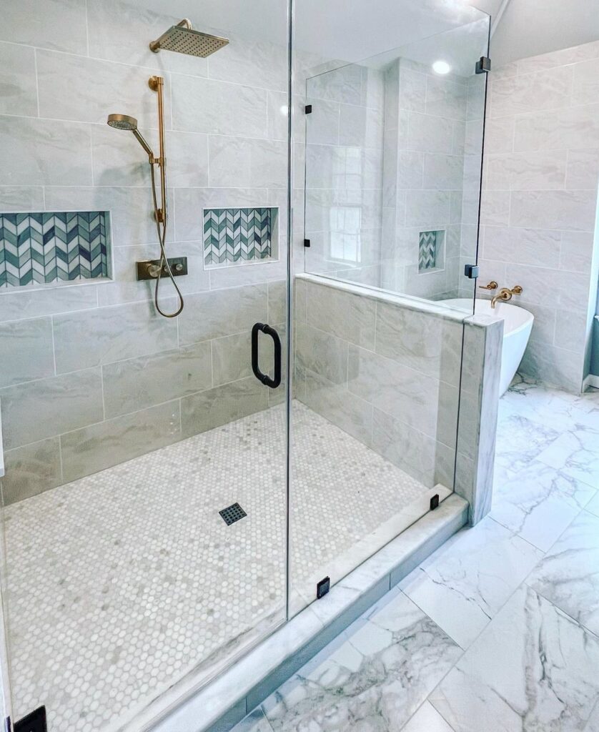 Stationary glass panels that create bright, spa-like walk-in showers.